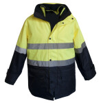 Code:4in1 300D hevy duty breathable polyester/PU, Seam-sealed, waterproof outer shell, matching colour mesh lining, foldaway hood, Storm cuffs with adjustable sleeve tabs, with reflective tape front & back, zop off removable Hivis vest, embroidery access. AVAILABLE COLOR: FLURO YELLOW / NAVY; FLURO ORANGE / NAVY.